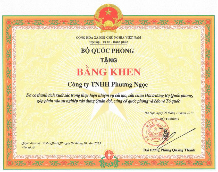 “Hội trường Bộ Quốc Phòng” là hội trường rộng và cao do vậy khi cải tạo đòi hỏi sự tỉ mỉ trong thiết kế lẫn phương án thực hiện. Trách nhiệm đặt lên vai Phương Ngọc càng cao khi chủ đầu tư yêu cầu thiết kế và thi công trong thời gian ngắn, thêm vào đó đây là công trình mang tính chất chính trị nên những quy định về xác minh lí lịch cũng như công tác kiểm tra ra vào rất nghiêm ngặt. Tuy nhiên, bằng kinh nghiệm chuyên môn và sự chuyên nghiệp trong  điều hành quản lí thi công Phương Ngọc đã hoàn thành xuất sắc nhiệm vụ được giao và vinh dự nhận được Bằng khen do Bộ trưởng Bộ Quốc phòng trao tặng.